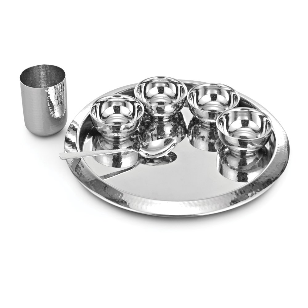 The Deluxe Thali Set (7 Pieces) is a beautifully handcrafted dining set made from premium hammered stainless steel, offering a perfect balance of elegance and durability. Designed for luxury dining and high-end hospitality, this thali set brings traditional Indian dining to modern tables. The round hammered salver provides a striking base, complemented by deep vatis for curries and dals, a royal glass for beverages, and a finely finished spoon for effortless dining. Crafted with precision and single-wall construction, this set is lightweight, easy to maintain, and ideal for everyday use in restaurants, hotels, and homes. The hammered texture not only enhances grip but also reflects artisanal excellence, making it an excellent choice for fine dining, festive serving, or gifting.