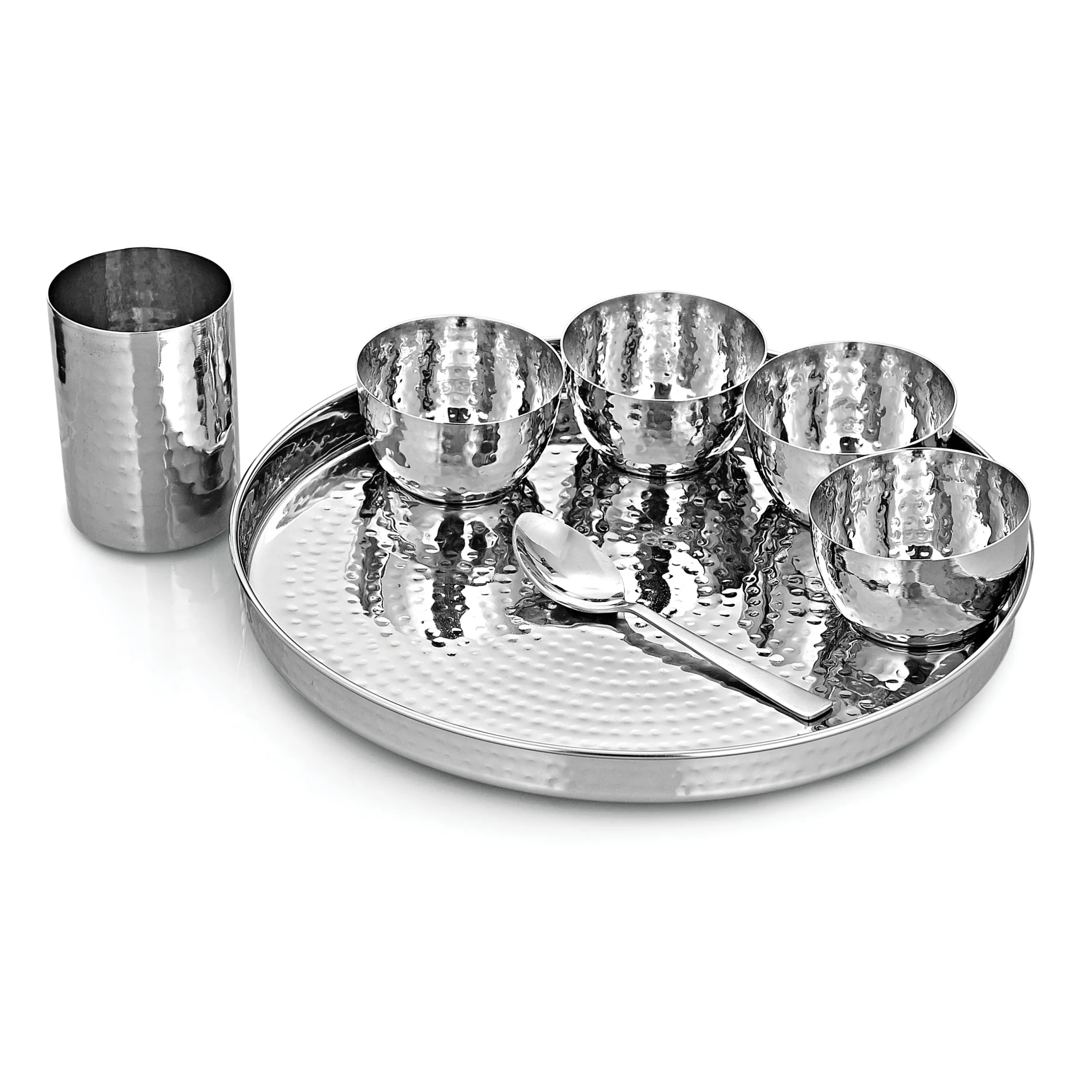 The Economy Thali Set (7 Pieces) is an elegant and practical stainless steel dining set designed for everyday use in restaurants, hotels, canteens, and home dining. Expertly handcrafted in hammered stainless steel, this single-wall thali set combines durability with timeless Indian craftsmanship. Each piece is perfectly proportioned for a complete dining experience — featuring a sturdy round thali, four katoris for curries and dals, a royal glass for beverages, and a baby spoon for easy serving. Its hammered texture enhances grip and visual appeal, making it ideal for both traditional and modern table settings. Designed for high-volume hospitality use and easy maintenance, the Economy Thali Set is a staple for efficient, elegant, and long-lasting service.