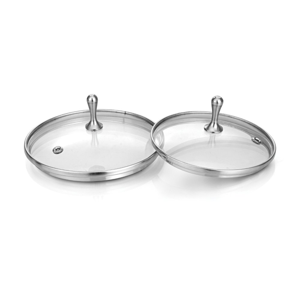Clear glass handi lid with stainless steel knob, allowing visibility while keeping food warm, ideal for catering displays and buffet service.