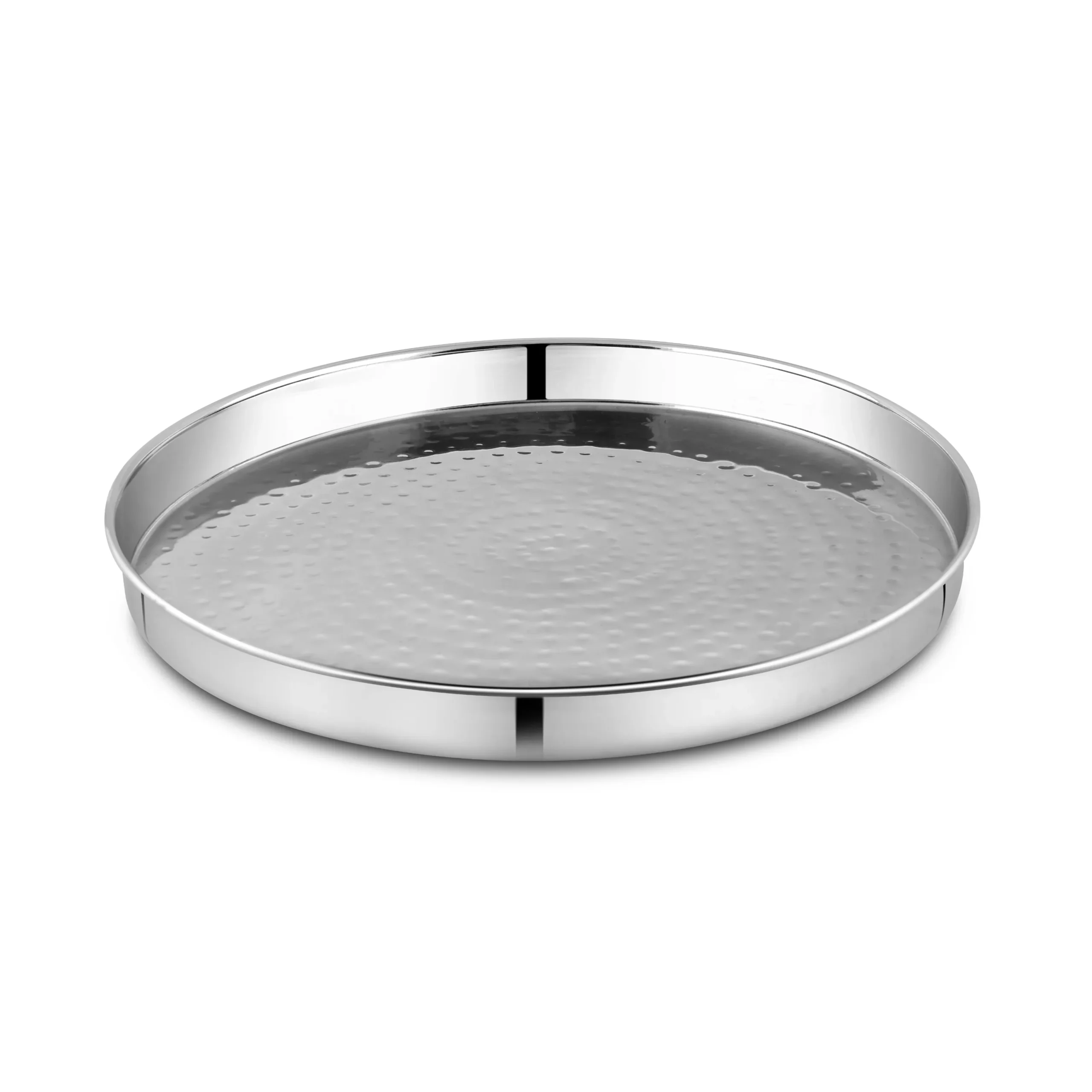 The Khomcha Thali is a traditional yet modern serving solution, handcrafted in premium stainless steel with a hammered finish. Designed with a single wall and deep rim, this thali is both durable and practical for commercial as well as household use. Its sturdy construction makes it ideal for heavy-duty serving in hotels, restaurants, catering, and banquets, while the hammered detailing adds a touch of elegance to food presentations. With its wide surface and raised edges, the Khomcha Thali is perfect for serving complete meals, Indian thalis, or buffet portions, offering a blend of functionality, hygiene, and timeless design.