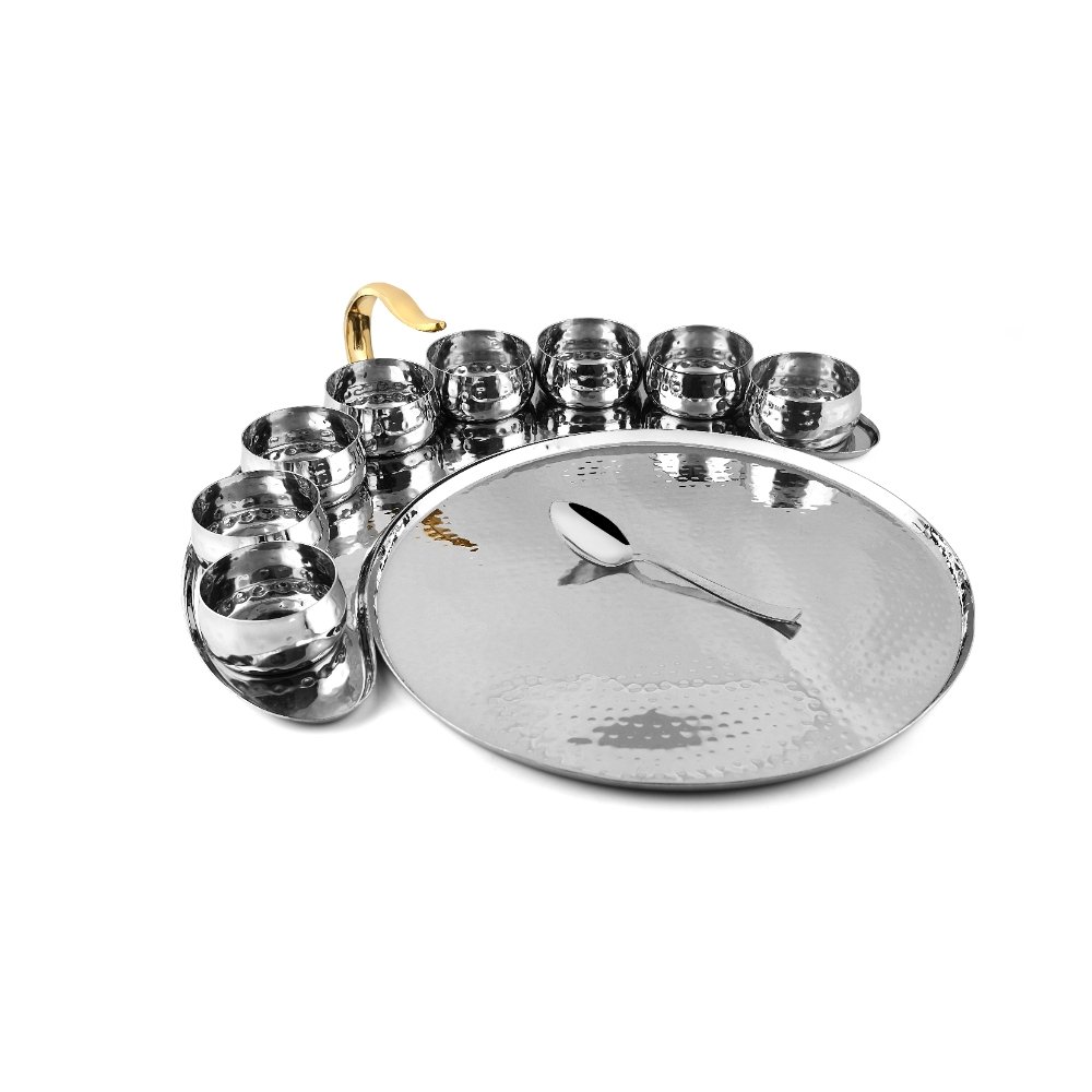 The Majestic Thali Set – Big (11 Pieces) is a masterpiece of Indian craftsmanship, designed for luxury dining and five-star hospitality experiences. Expertly handcrafted in hammered stainless steel with a signature brass handle accent, this thali set exudes sophistication and cultural richness. Each element has been thoughtfully designed to offer durability, shine, and balance, making it perfect for restaurants, hotels, catering, and elegant home dining. The large moon-shaped platter and coordinated accessories create a regal dining setup that beautifully presents Indian cuisine while reflecting the timeless artistry of metalwork. Combining function with grandeur, the Majestic Thali Set brings an exquisite touch of India’s culinary tradition to every table.