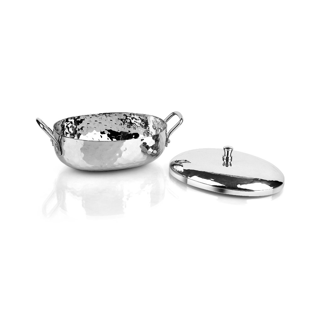 The Oval Boat Pan with Lid is a premium stainless steel serving pan designed with a hammered finish and sturdy side handles, making it both elegant and functional. Its unique oval boat shape with a fitted lid helps retain heat, keeping food warm for longer while enhancing presentation. Ideal for serving Indian curries, gravies, rice dishes, and continental cuisines, this lidded serving pan is widely used in hotels, restaurants, catering services, and fine dining setups. Crafted from durable stainless steel, it combines traditional craftsmanship with modern durability, making it a perfect choice for professional chefs as well as home kitchens.
