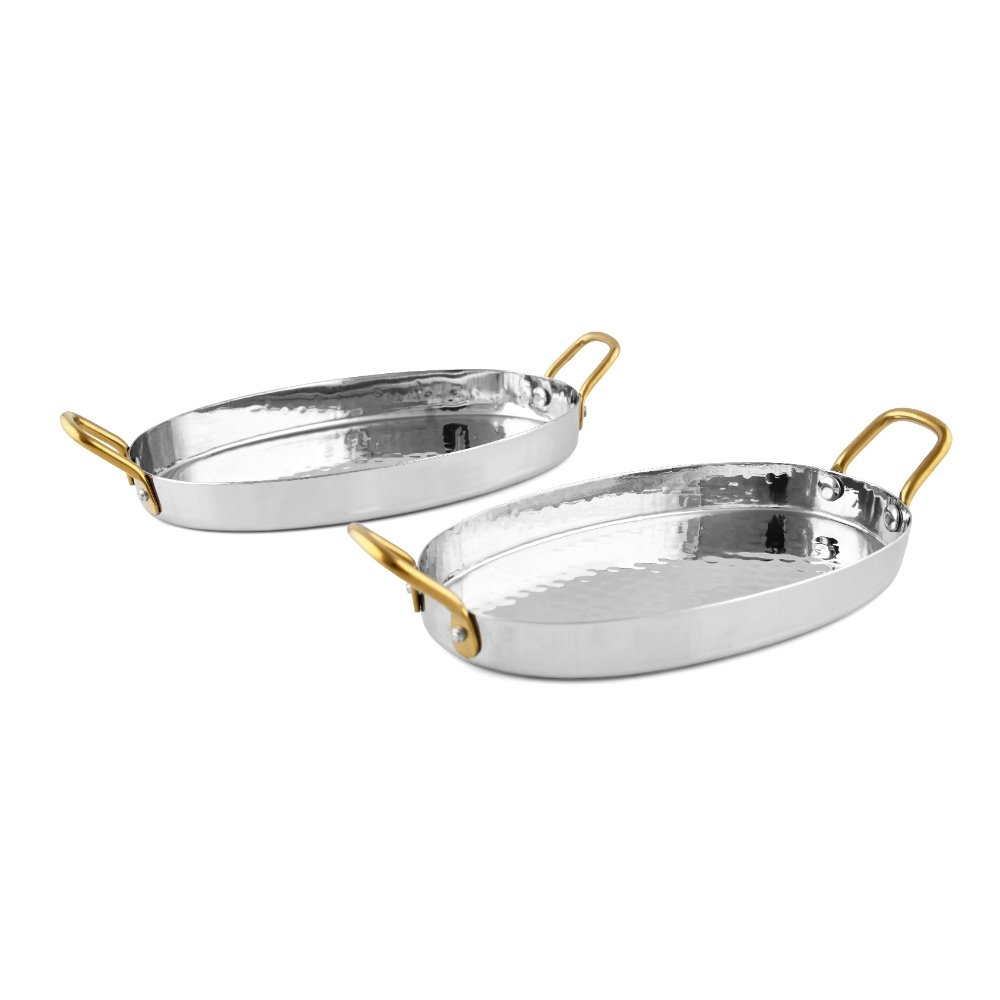The Oval Flat Pan with Golden Handle is an elegant hammered stainless steel serveware piece, designed to bring luxury and functionality to professional dining. Its sleek oval shape is perfect for serving kebabs, grilled items, appetizers, or desserts with a refined presentation. The hammered finish adds artisanal appeal, while the golden handles provide a touch of sophistication, making it ideal for restaurants, hotels, and banquets. Durable, lightweight, and stylish, this pan ensures food presentation is both attractive and memorable.
