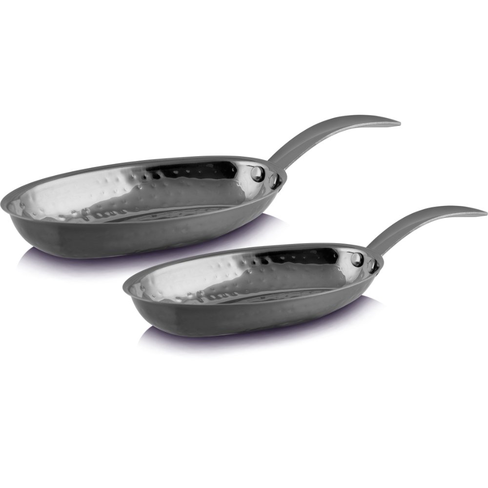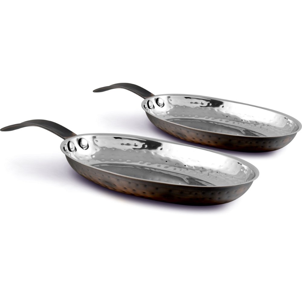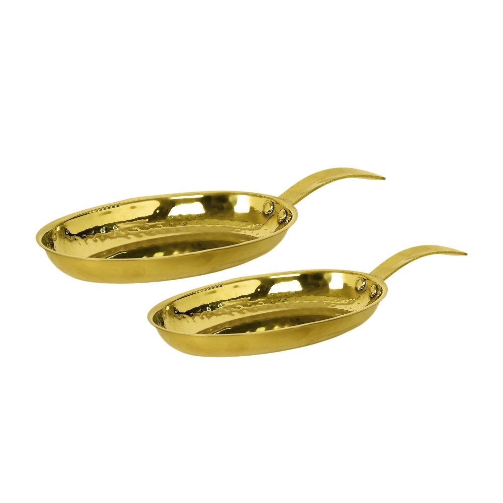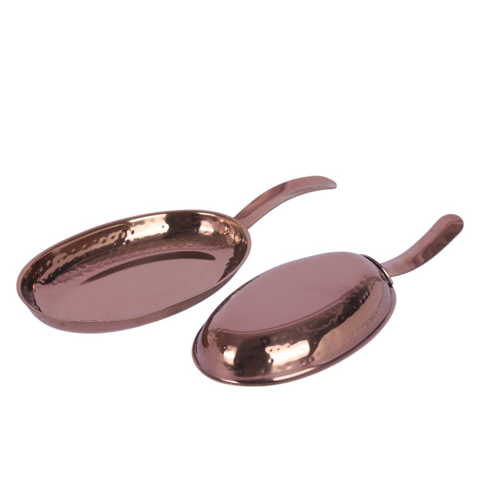 The Oval Pan with Long Golden Handle is a premium handcrafted serveware piece designed for hotels, restaurants, and catering services that value both elegance and durability. Made from high-grade stainless steel with a hammered finish, it features a unique elongated oval shape that enhances food presentation in fine dining and buffet setups. The long golden handle ensures a comfortable grip while adding a touch of luxury. Available in multiple finishes—Gold PVD, Rose Gold PVD, Gun Metal PVD, and Antique Copper Electroplated—this versatile pan is perfect for serving curries, appetizers, gravies, snacks, and desserts. Built to last with corrosion resistance and easy maintenance, it seamlessly blends traditional craftsmanship with modern hospitality requirements, making it an ideal choice for professional kitchens, banquets, and restaurants.