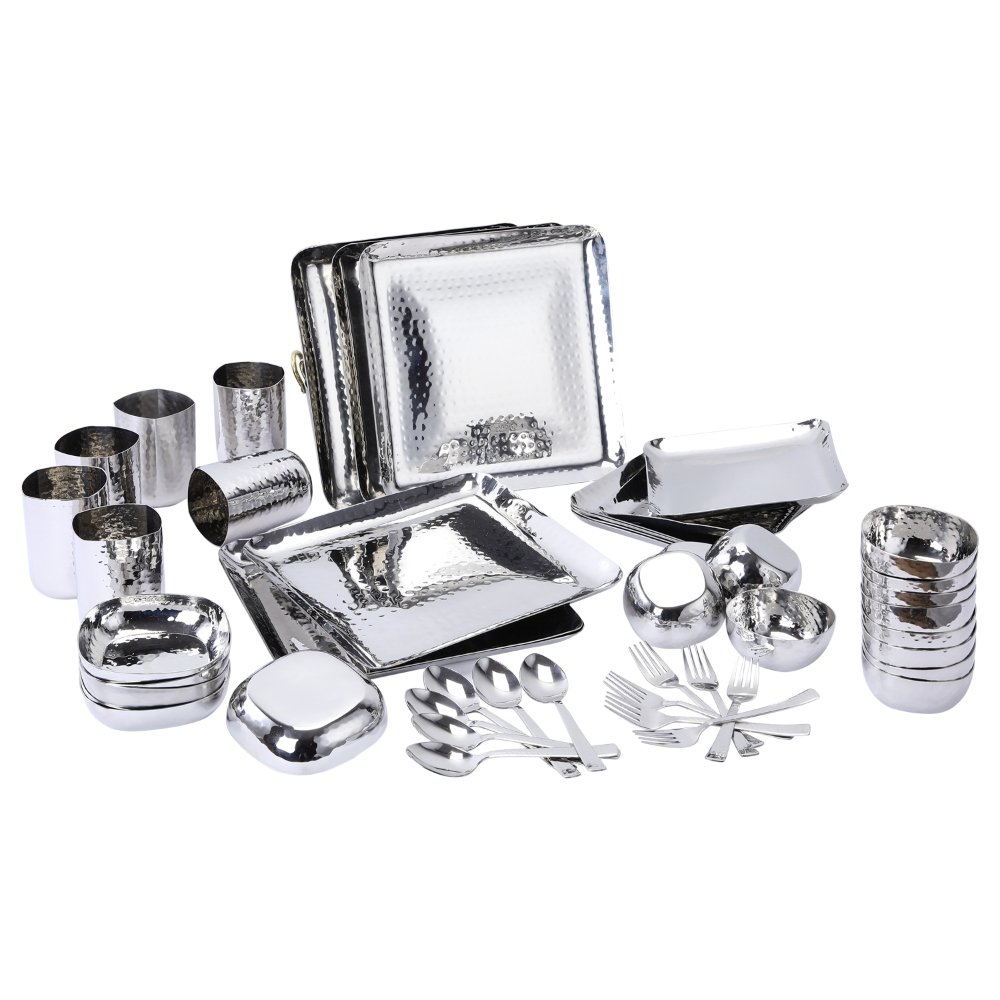 The Radiant Six Gift Set is an opulent 48-piece dinnerware collection that celebrates modern angular design while honoring traditional Indian dining. Meticulously crafted in 18-gauge hand-hammered stainless steel, this set includes large dinner plates, quarter plates, subzi vatis, dessert bowls, glasses, spoons, and forks — offering everything needed for a complete dining experience. Available in both timeless stainless steel and a luxurious gold PVD finish, Radiant Six is the ultimate choice for weddings, festive occasions, and high-end gifting. Its bold square design and impeccable craftsmanship make it a true centerpiece for any table.