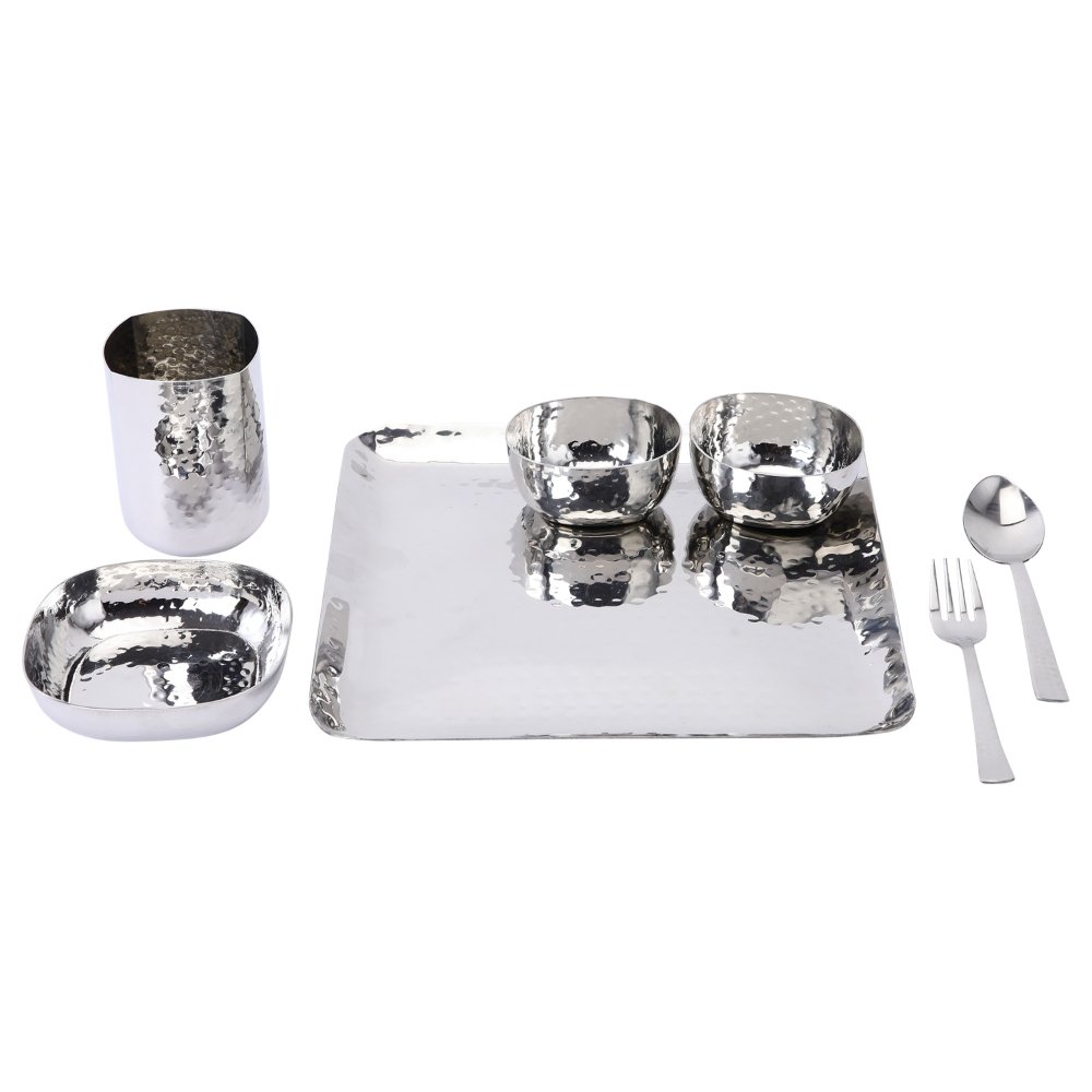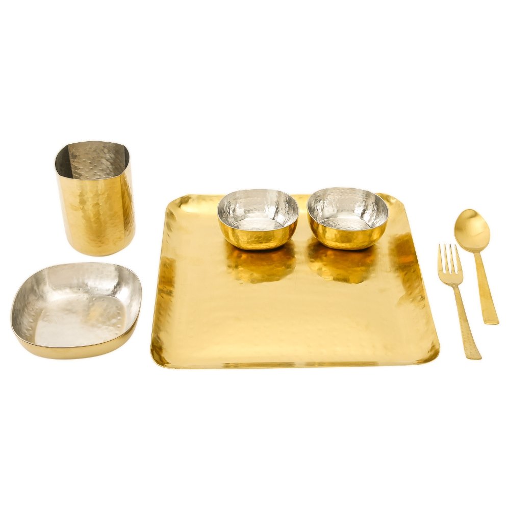 The Radiant Uno Gift Set is a modern take on traditional dining, crafted in 18-gauge hand-hammered stainless steel for elegance and durability. This thoughtfully curated set includes a square thali, subzi vatis, dessert/rice bowl, glass, baby spoon, and baby fork, making it versatile for both daily dining and festive occasions. Designed to blend functionality with luxury, Radiant Uno is available in a classic stainless steel finish and a premium gold PVD finish, perfect for wedding trousseaus, baby gifting, anniversaries, and corporate hampers.