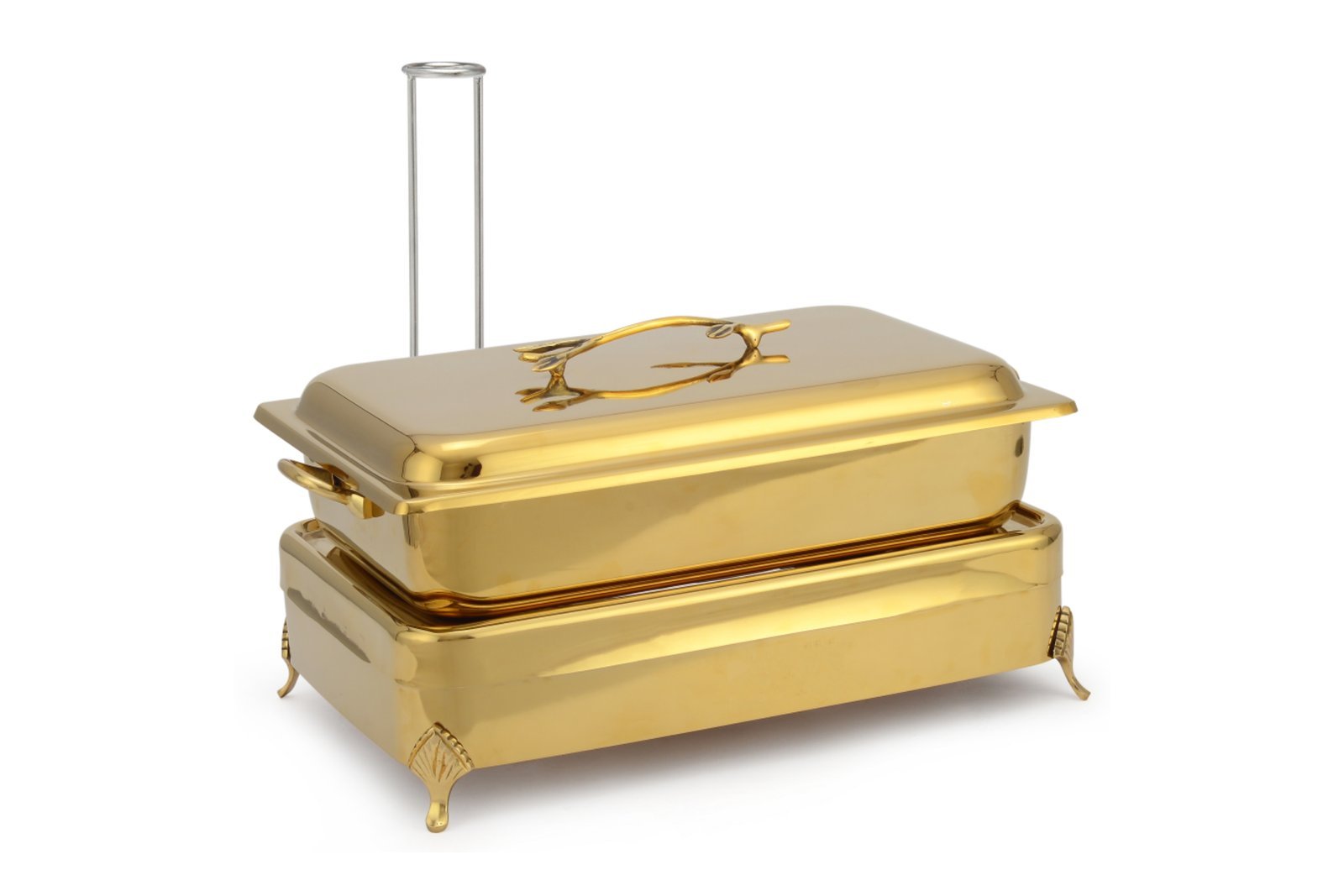 Designed for grandeur, the Rectangular Dish Lift Top with Flora Lid is ideal for showcasing large-portion delicacies in buffet service. Made in durable stainless steel with a mirror finish, it features a distinctive floral-inspired lid that elevates the dining presentation. With a generous 9,000 ml capacity, it ensures efficiency for catering big events, banquets, or luxury hotel dining while enhancing buffet aesthetics.