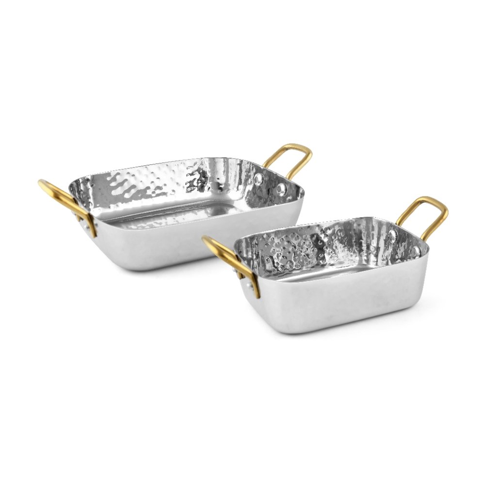 The Rectangular Pan with Golden Handle is a premium hammered stainless steel serveware piece designed for modern dining presentation. Its rectangular deep shape makes it perfect for serving kebabs, curries, and appetizers with a contemporary flair. The hammered finish adds artisanal charm, while the elegant golden handles elevate the look, making it ideal for hotels, restaurants, banquets, and fine dining. Durable, stylish, and versatile, this pan enhances every tablescape with sophistication.