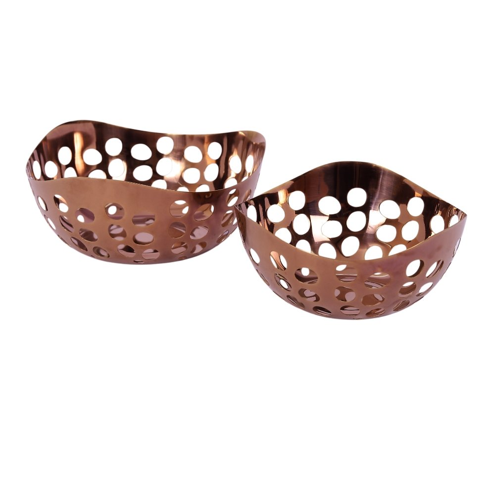 The Round Bread Basket – Wave Design is a premium stainless steel serving basket crafted with a unique wavy rim and stylish cut-out pattern. Available in Mirror, Gold PVD, Rose Gold PVD, and Gun Metal PVD finishes, this basket combines functionality with a contemporary design that elevates any dining experience. Its sturdy single-wall construction ensures durability, while the smooth edges and polished surface add elegance to restaurant buffets, hotel dining, and catering events. Perfect for serving bread, rolls, fruits, or snacks, this wave basket brings a modern aesthetic to fine dining and casual service alike. Designed for heavy-duty use, it resists tarnishing, is easy to clean, and enhances presentation in professional hospitality settings.