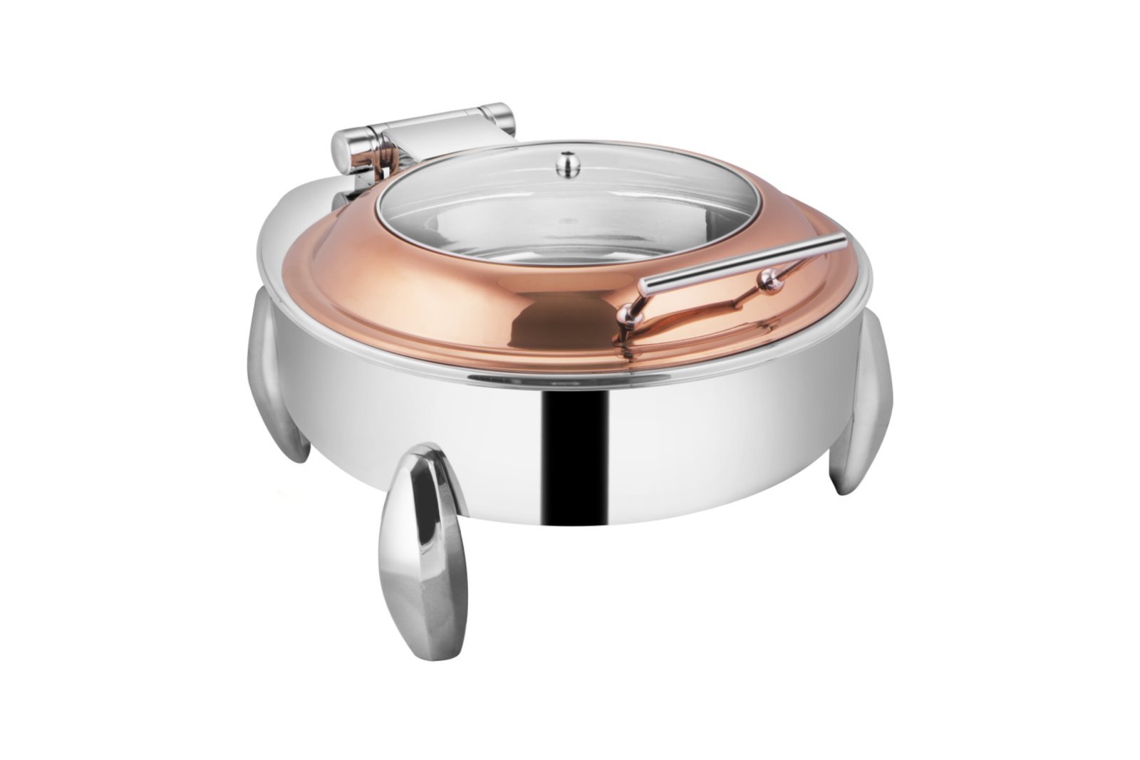 The Round Dish Hydraulic Collection with Diamond Legs is a premium range of chafing dishes designed for luxury buffet presentations. Crafted from stainless steel with mirror finishes and available with elegant glass or rose gold lids, these dishes combine durability with sophistication. The hydraulic mechanism ensures smooth and safe lid operation, while the diamond-shaped legs provide superior stability and a striking visual appeal. With a generous 7000 ml capacity, they are ideal for serving gravies, curries, rice, or continental dishes at hotels, banquets, and upscale catering events. Blending functionality with high-end aesthetics, this collection elevates the dining experience in any professional setup.