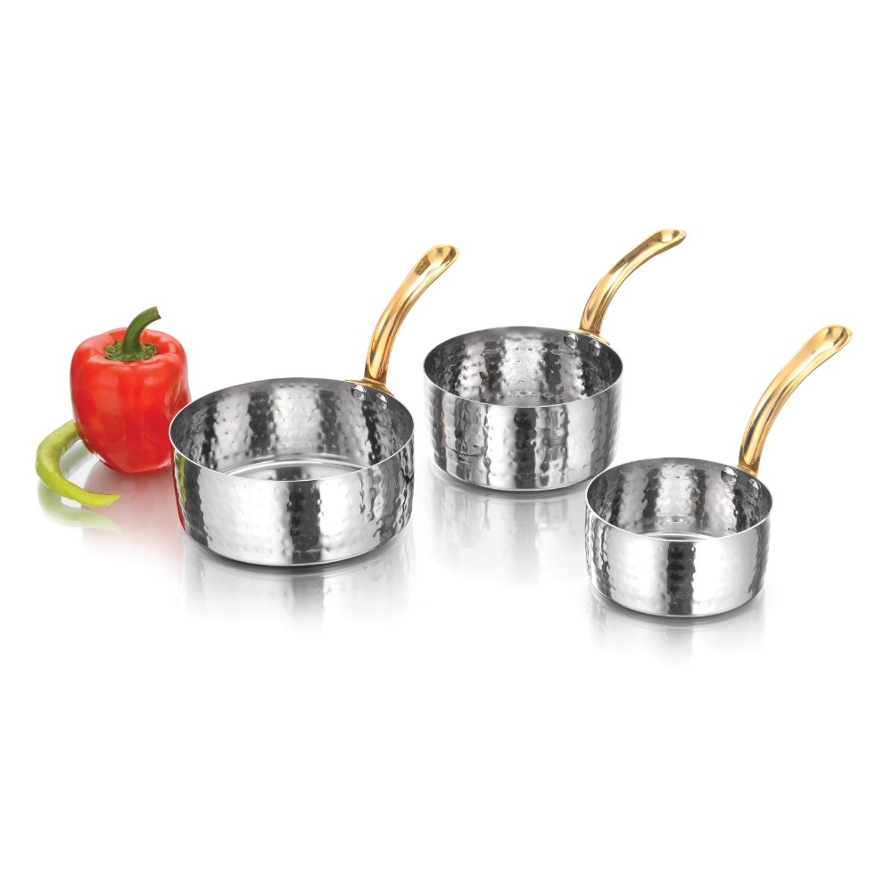 The Sauce Pan with Golden Handle is a premium hammered stainless steel pan designed for professional food service and elegant table presentation. Its hammered texture highlights artisanal craftsmanship, while the golden handle adds a touch of luxury and sophistication. Lightweight yet sturdy with single-wall construction, this pan is ideal for portion serving, sauces, gravies, soups, desserts, or condiments in hotels, restaurants, banquets, and catering setups. The ergonomic golden handle ensures comfortable grip and easy handling, making it as functional as it is stylish. Perfect for upscale buffets, fine dining, and catering events, this hammered stainless steel sauce pan enhances the dining experience with its blend of tradition and modern aesthetics.