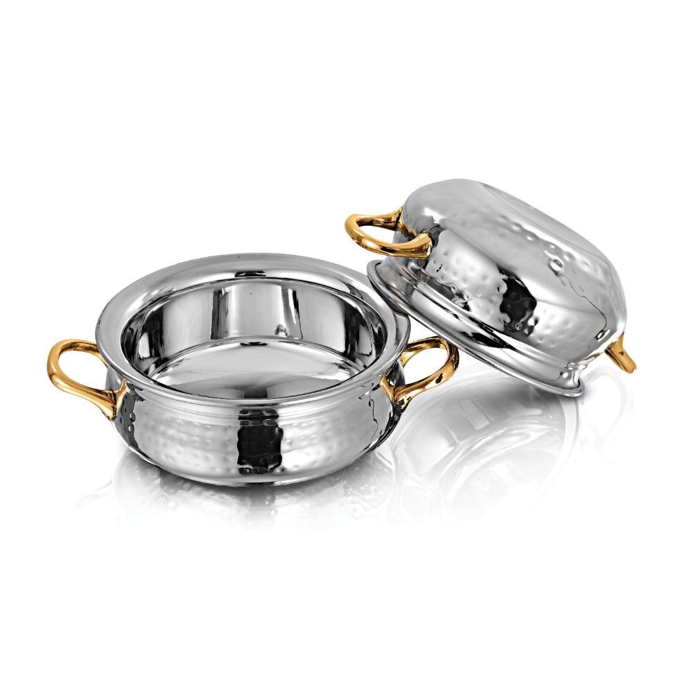 Premium stainless steel double-wall serving handi with hand-hammered finish and welded brass handles, designed for hotels, restaurants, and catering services. Retains heat longer while adding elegance to buffets and fine dining.