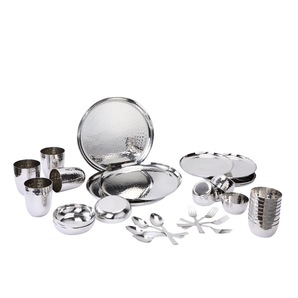 The Solitaire Four Gift Set is a complete dining collection crafted to combine tradition with elegance. Made from 18-gauge hand-hammered stainless steel, this 36-piece set includes dinner plates, quarter plates, subzi vatis, dessert bowls, glasses, and cutlery essentials, making it a luxurious choice for family dining or gifting. Available in classic stainless steel and an opulent gold PVD finish, it is perfect for weddings, festive occasions, and premium corporate gifting. This set celebrates both functionality and artistry, ensuring a dining experience that feels regal every day.