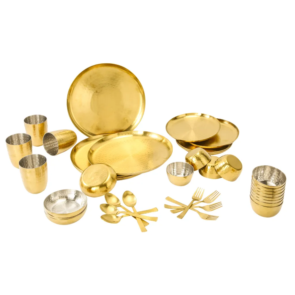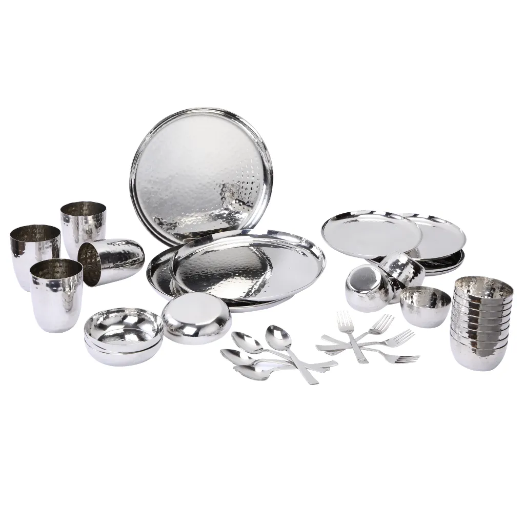 The Solitaire Four Gift Set is a complete dining collection crafted to combine tradition with elegance. Made from 18-gauge hand-hammered stainless steel, this 36-piece set includes dinner plates, quarter plates, subzi vatis, dessert bowls, glasses, and cutlery essentials, making it a luxurious choice for family dining or gifting. Available in classic stainless steel and an opulent gold PVD finish, it is perfect for weddings, festive occasions, and premium corporate gifting. This set celebrates both functionality and artistry, ensuring a dining experience that feels regal every day.
