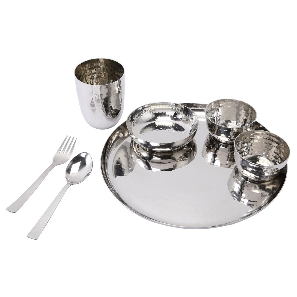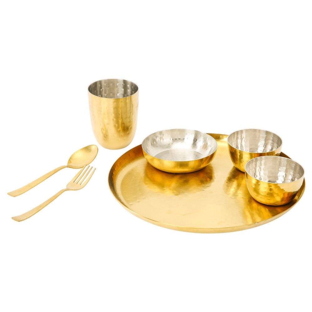 The Solitaire Uno Gift Set combines timeless Indian dining traditions with contemporary elegance. Handcrafted in 18-gauge hand-hammered stainless steel, this set includes a round thali, subzi vatis, dessert/rice bowl, glass, baby spoon, and baby fork — perfect for both everyday use and special gifting. Available in the classic stainless steel finish and the luxurious gold PVD finish, Solitaire Uno makes a thoughtful choice for weddings, anniversaries, baby gifts, festive occasions, and premium corporate gifting.